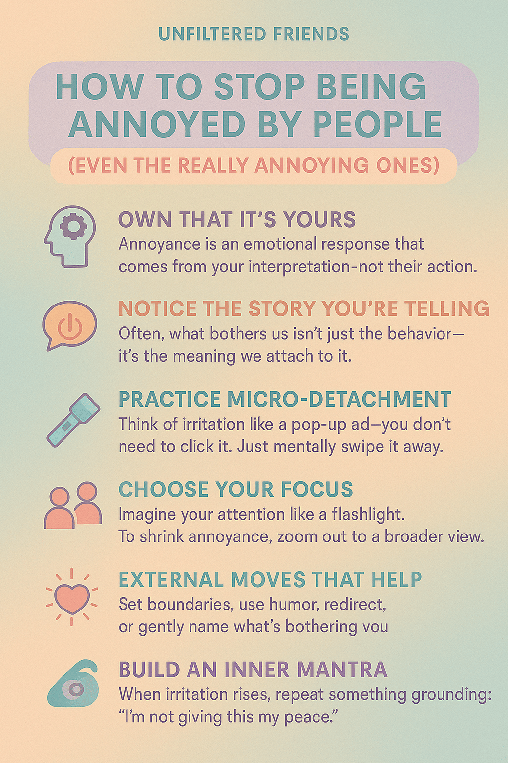 Annoyance is an emotional response that comes from your interpretation, not their action. That doesn’t mean their behavior isn’t objectively irritating, but the reaction is yours. When you catch yourself boiling inside, pause and remind yourself: “This feeling belongs to me. And if it belongs to me, I can shift it.”
